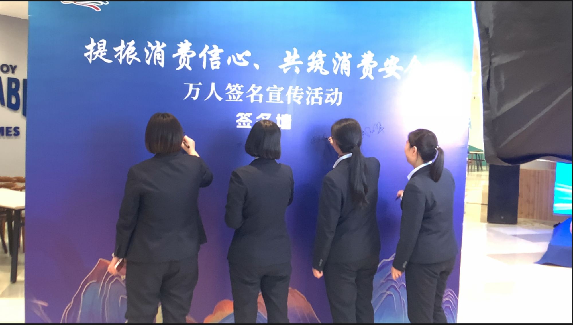 活動中,九州商業(yè)大廈解放路店組織員工代表在六樓商場觀看了主會場的宣傳活動情況,同時連線主會場進行集體承諾發(fā)言,活動結(jié)束后大家移步到簽名墻進行簽名。