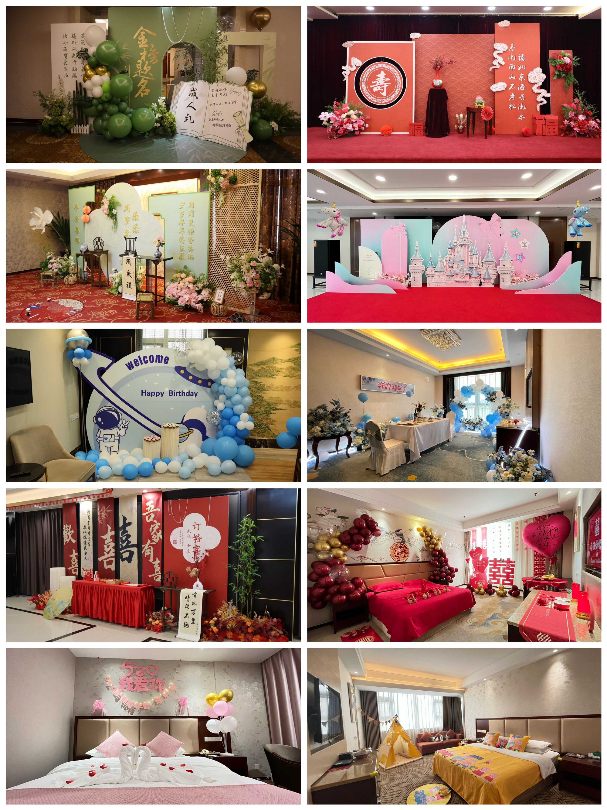 比賽中,各部位根據(jù)房型、宴會類型等設(shè)計出了不同場景布置主題。在客房場景上分別設(shè)計布置了滿足家庭出游需要的“陽光親子房”,浪漫、溫馨、喜慶的“鐘愛一生”發(fā)嫁房,充滿愛意的“傾城之戀”“鐘愛一生”情侶房。在用餐場景上分別以寶寶周歲、兒童生日為切入點設(shè)計了“掌中寶”和“未來可期”主題包間場景;以寶寶宴、壽宴為思路打造了“夢幻城堡”“松鶴延年”主題宴會廳布置;并制作了適用于升學、定親場景的“金榜題名”“永結(jié)同心”主題布置。在設(shè)計上參賽選手巧妙地融合了國潮風、卡通風等不同元素,呈現(xiàn)出一個個富有創(chuàng)意且充滿個性化的場景布置,場景布置充分體現(xiàn)實用性和美觀性。