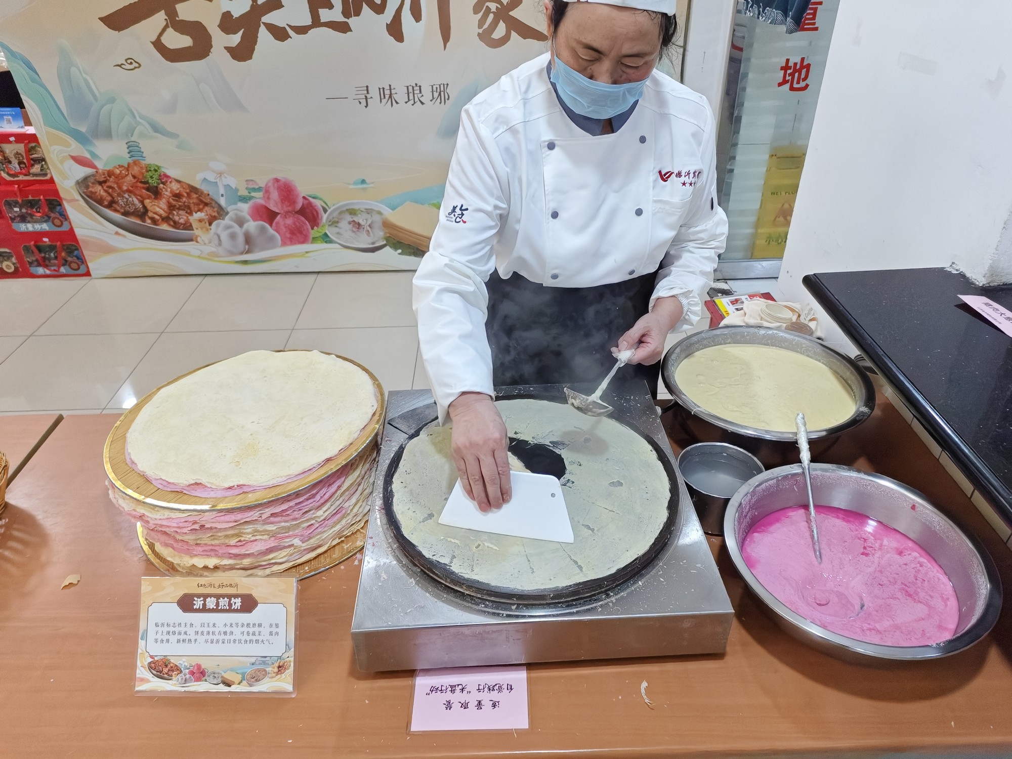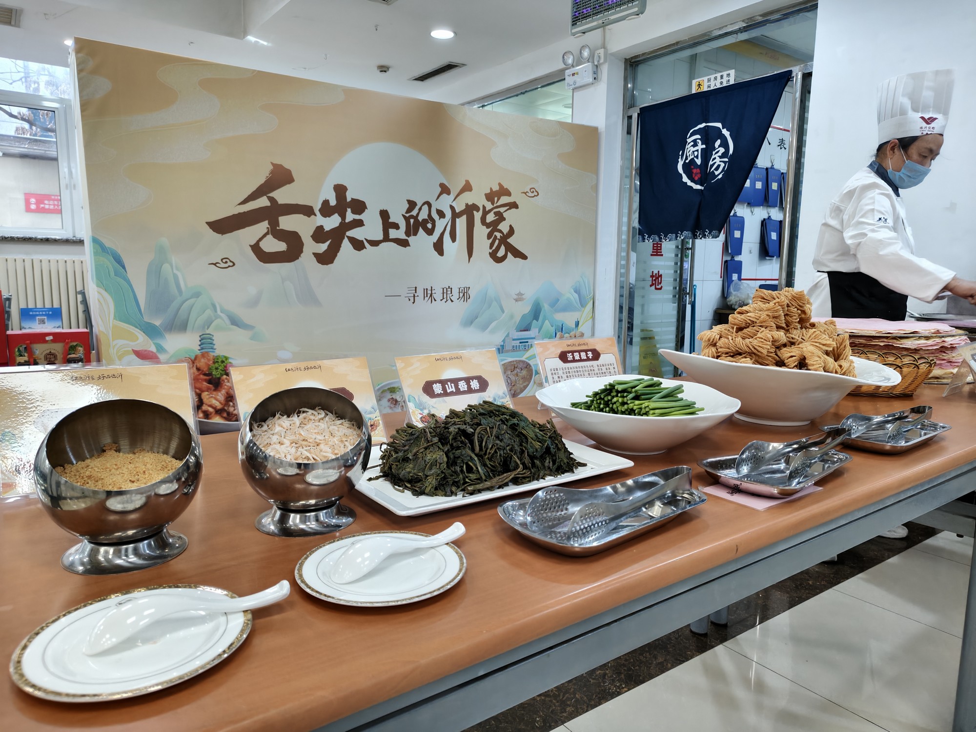 活動期間,臨沂賓館廚師團隊?wèi)?yīng)邀入駐中國貿(mào)促會機關(guān)食堂,每日午餐匠心烹制熱菜、特色醬菜等菜品。其間,精心推出了臨沂炒雞、蒙山全羊湯、醇香糝湯、蒙陰光棍雞、酥香牛蒡等12道地道沂蒙菜肴;現(xiàn)場烙制臨沂煎餅,搭配特色馓子、香椿、蒜薹等,讓賓客沉浸式體驗沂蒙傳統(tǒng)特色美食,受到賓客一致好評。