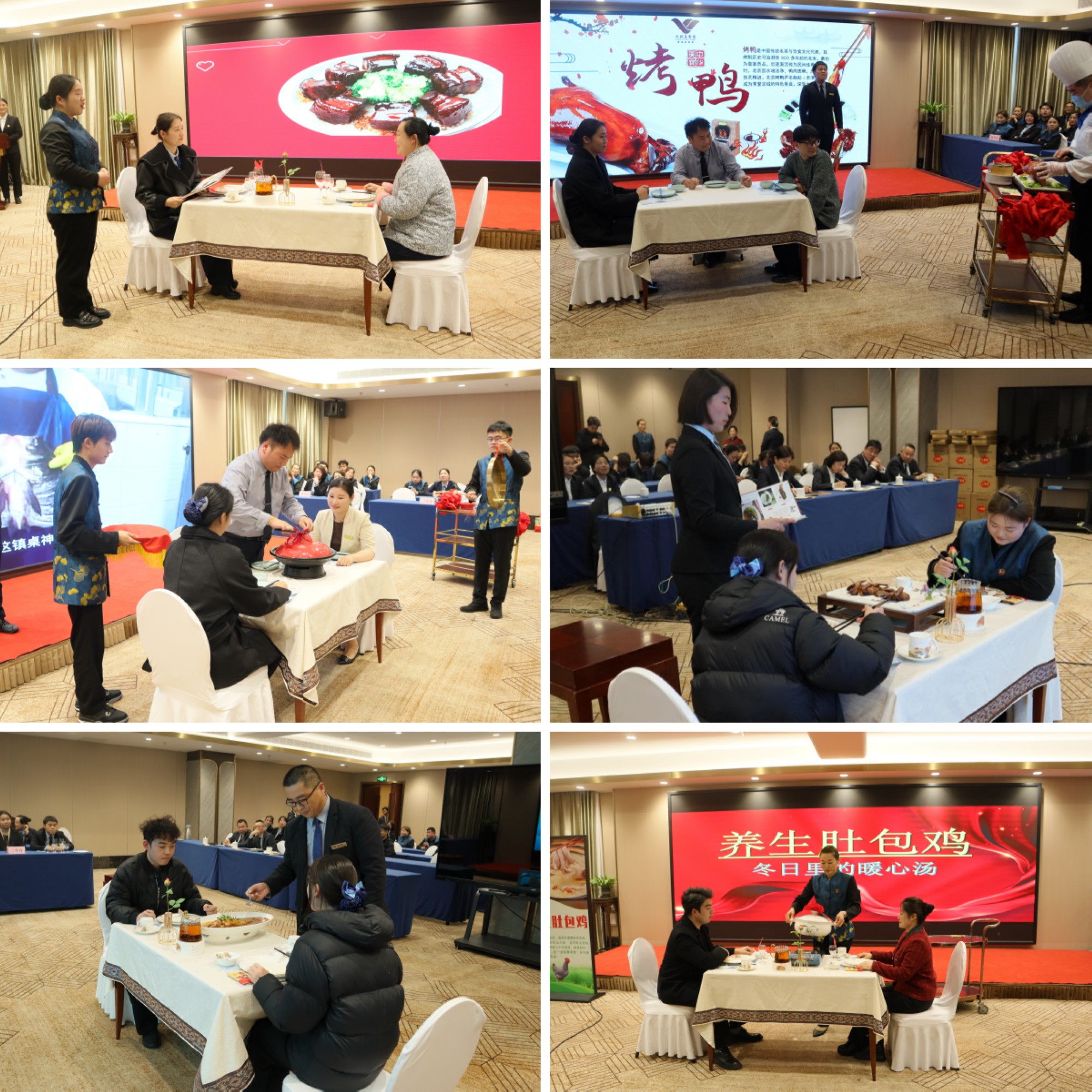 本次競賽設(shè)有必答題、搶答題和情景模擬等環(huán)節(jié);必答題環(huán)節(jié)選手按順序獨立作答,檢驗菜品知識儲備;搶答題環(huán)節(jié)既要配合搶答又要熟練掌握菜品特色,節(jié)奏緊湊、你來我往,充分展現(xiàn)出比拼的激烈;情景模擬環(huán)節(jié)聚焦貴妃紅燒肉、九州烤鴨、黃燜胖魚頭、脆皮乳鴿、膠東燜魚、養(yǎng)生肚包雞等賓館招牌經(jīng)典菜,現(xiàn)場演繹服務(wù)場景、介紹菜品特色及文化,贏得陣陣掌聲。