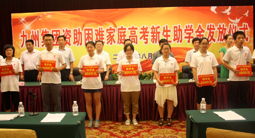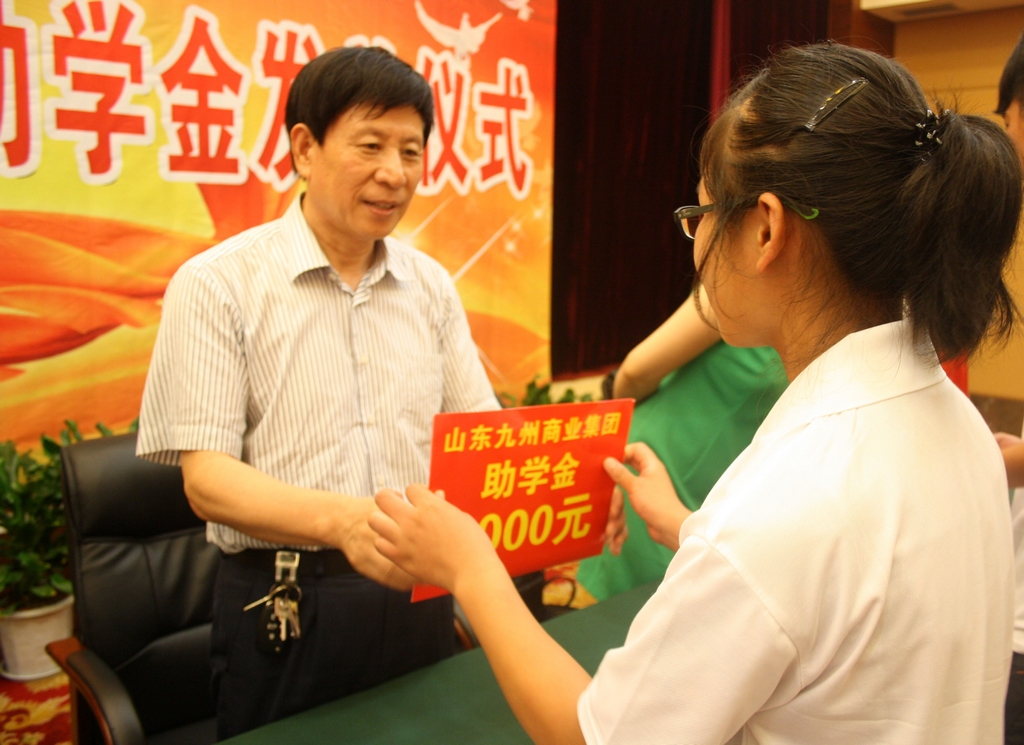 受助學(xué)生 8月15日,九州集團(tuán)2013年度資助困難家庭高考新生助學(xué)金發(fā)放儀式在臨沂賓館大學(xué)酒店舉行。張聞?dòng)睢埖栌嗟仁蓄I(lǐng)導(dǎo),楊沂城、王佐文等集團(tuán)領(lǐng)導(dǎo)出席九州助學(xué)金發(fā)放儀式,F(xiàn)場(chǎng)100名優(yōu)秀困難高考新生總計(jì)獲得40萬助學(xué)金。 市政府黨組成員、市高新技術(shù)開發(fā)區(qū)管委會(huì)主任、市慈善總會(huì)會(huì)長(zhǎng)張聞?dòng)钤谥鷮W(xué)金儀式上講話,對(duì)我集團(tuán)急困難學(xué)生之所急,伸出友愛之手,連續(xù)多年救助困難家庭學(xué)生給予肯定,對(duì)我集團(tuán)積極參與公益事業(yè),支持我市慈善事業(yè)發(fā)展表示感謝。 集團(tuán)董事長(zhǎng)楊沂城在致辭中,代表集團(tuán)對(duì)在今年高考中取得優(yōu)異成績(jī)的同學(xué)們表示祝賀。對(duì)受助同學(xué)們身處逆境、自強(qiáng)不息、追求夢(mèng)想的拼搏精神,刻苦學(xué)習(xí)、立志成才、不畏困難的吃苦精神給予了充分肯定,勉勵(lì)受助的同學(xué)們珍惜寶貴的學(xué)習(xí)機(jī)會(huì),豐富知識(shí)、堅(jiān)定信念、砥礪品格、磨練意志,努力成為社會(huì)有用之人、祖國(guó)棟梁之材。 受助學(xué)生代表在助學(xué)金發(fā)放儀式上發(fā)言,他們對(duì)我集團(tuán)的大愛之心、大善之舉,表達(dá)了由衷的感謝,紛紛表示進(jìn)入大學(xué)努力學(xué)習(xí),回報(bào)社會(huì),永遠(yuǎn)不會(huì)忘記九州集團(tuán)的幫助。 九州助學(xué)金截至今年已發(fā)放六屆,六年來發(fā)放助學(xué)金200余萬元,資助優(yōu)秀高考新生600余名。“圓夢(mèng)沂蒙”已成為我市著名的慈善助學(xué)品牌,榮獲“山東慈善獎(jiǎng)最具影響力慈善項(xiàng)目”。 多年來,集團(tuán)在事業(yè)發(fā)展的同時(shí),始終秉承“敬業(yè)報(bào)國(guó) 奉獻(xiàn)社會(huì)”的經(jīng)營(yíng)理念,積極投身慈善事業(yè),勇于承擔(dān)社會(huì)責(zé)任。近年來,在臨沂市慈善總會(huì)的大力支持下,先后組織實(shí)施了“情暖萬家”、“朝陽助學(xué)”、“夕陽扶老”、“康復(fù)助醫(yī)”和“愛心助殘”等救助工程,累計(jì)為慈善事業(yè)捐款捐物近千萬元,為我市慈善事業(yè)的發(fā)展作出了應(yīng)有貢獻(xiàn)。